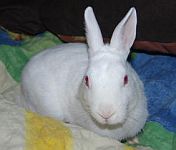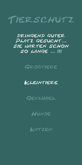 | ^ 3. Jannes Der kleine Jannes saß bis vor kurzem noch bei einem Futterhändler in einer Box, zusammen mit anderen Kaninchen und Meerschweinchen, die ihn gebissen haben. Schnell war klar, dass er da sofort herausgeholt werden muss. Sein Zustand war wirklich schlimm. Er hatte mehrere Bisswunden an den Augen, auf der Stirn und eine große auf dem Rücken. Er war total dünn und abgemagert. Bei einer anschließenden Kotprobe wurden auch noch Kokzidien festgestellt. Jannes Alter wurde auf 8 bis 10 Wochen geschätzt.,In seiner momentanen Pflegestelle taut Jannes so ganz langsam auf. Er liebt sein Häuschen und fängt an, seine Umgebung zu erkunden. Seine Wunden verheilen langsam, aber recht gut, und er wird immer munterer und zutraulicher. Nun kann er vermittelt werden. Jannes sucht ein Zuhause in Innenhaltung. Wenn er in einem Innengehege leben soll, braucht man hohe Gitter. Da er immer noch ein Leichtgewicht mit 1 kg ist, sollte seine neue Freundin auch nicht so schwer sein. Er ist anfänglich scheu. Wenn er auftaut aber sehr neugierig. Geimpft ist er gegen RHD und Myxomatose. Vermittelt wird gegen Schutzvertrag und -Gebühr nach Vorkontrolle in käfigfreie Haltung. |