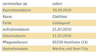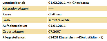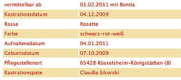 ... hatten wir im Sommer 2010 vermittelt. Er kam jetzt mit seiner Partnerin, Bonita, zu uns zurück. Die Haltung von Meerschweinchen wurde aus fam. Gründen aufgegeben. Chewbacca hat den Gesundheitscheck beim Tierarzt ohne Beanstandung gemeistert. Er ist zwar noch etwas scheu, aber wenn er sich eingelebt hat, dann ist er ein richtiger Wirbelwind. Sein Ruhepol ist Bonita, seine Partnerin. Auch in Zukunft möchte er bei ihr bleiben. Und so haben wir uns entschlossen, dass die beiden zusammen vermittelt werden. |